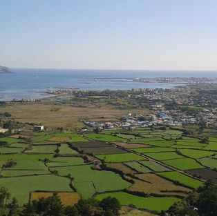 Following the path along the ridge takes you east towards the sea and a soft breeze which touches the patches of sweat on your t-shirt. The pine forest falls away behind you as you enter an opening on the clear, treeless side of the hill where two thin, long-haired horses graze. Below you is a thinner stretch of tidier patchwork fields, the village of Shi-heung-ri and the road from where you started. Beyond that are the angular concrete arms of the piers of several small docks for fishing boats, breaking through the black rocks of the coast and out into the restless tides of the open sea. The flat plains of the coast are interrupted only by the gigantic straight cliffs of Seongsan Ilchulbong oreum (Sunrise Peak) to the south, which stands tall like a castle above the port-village which shares its name.